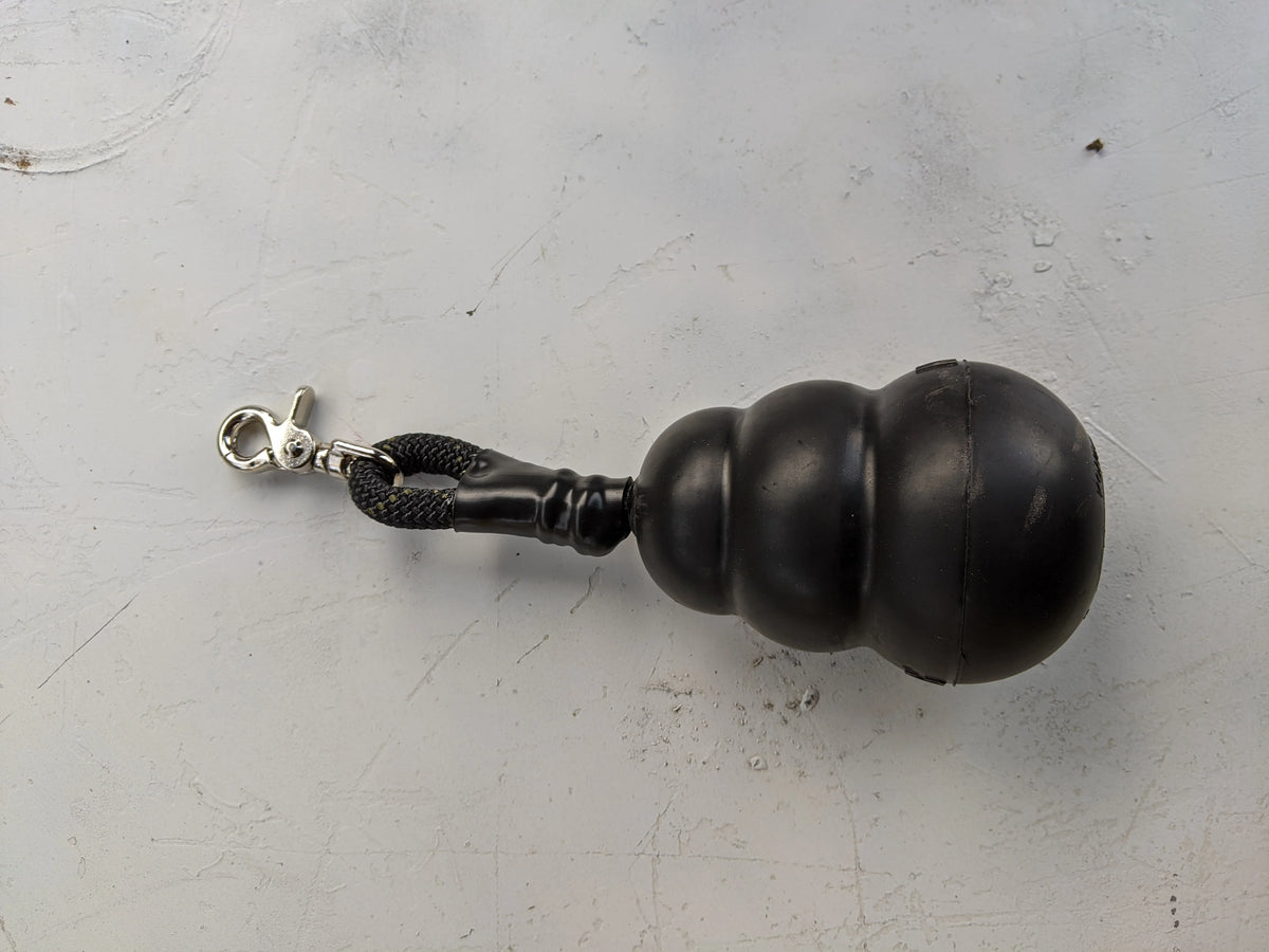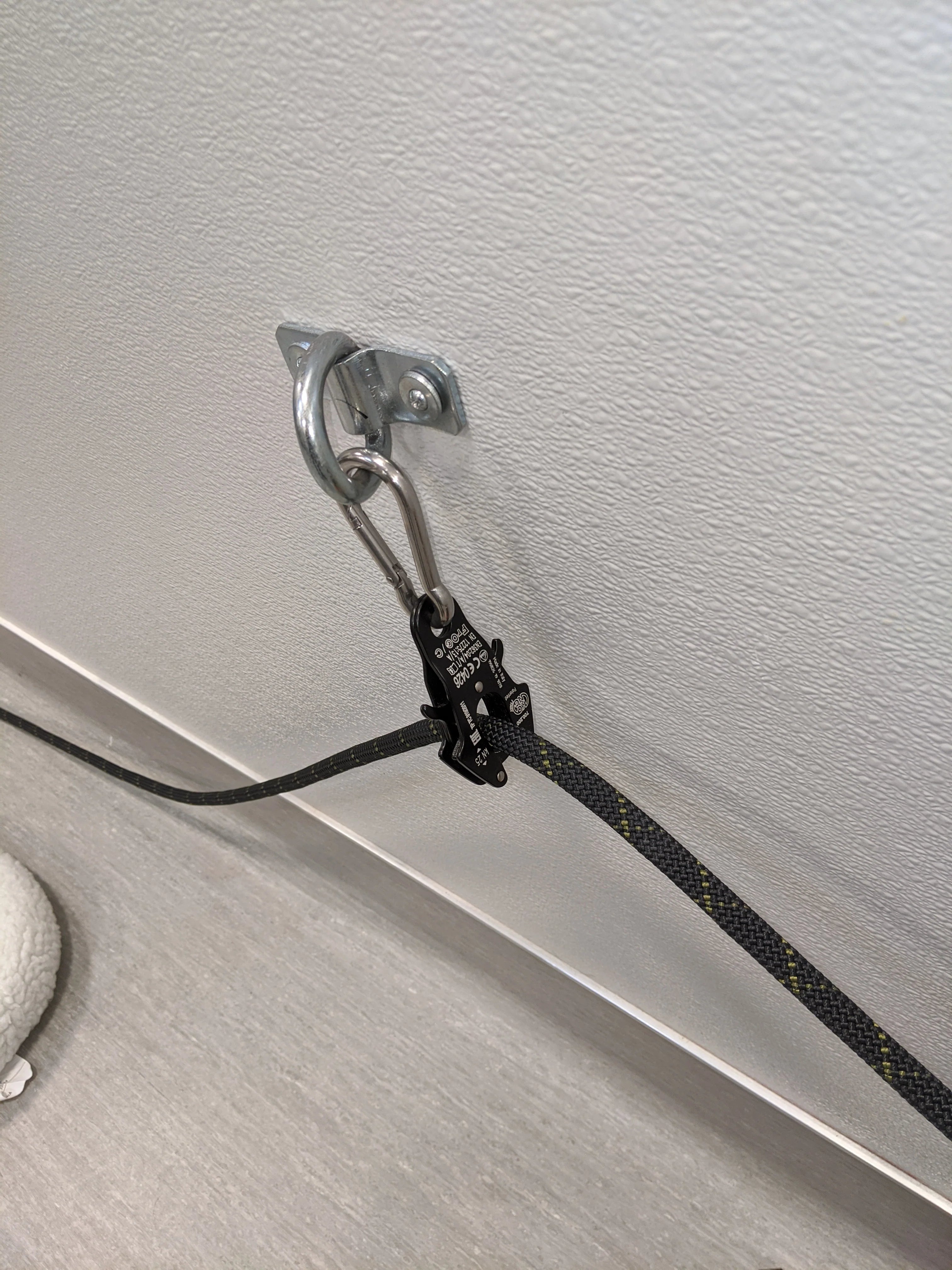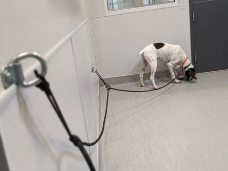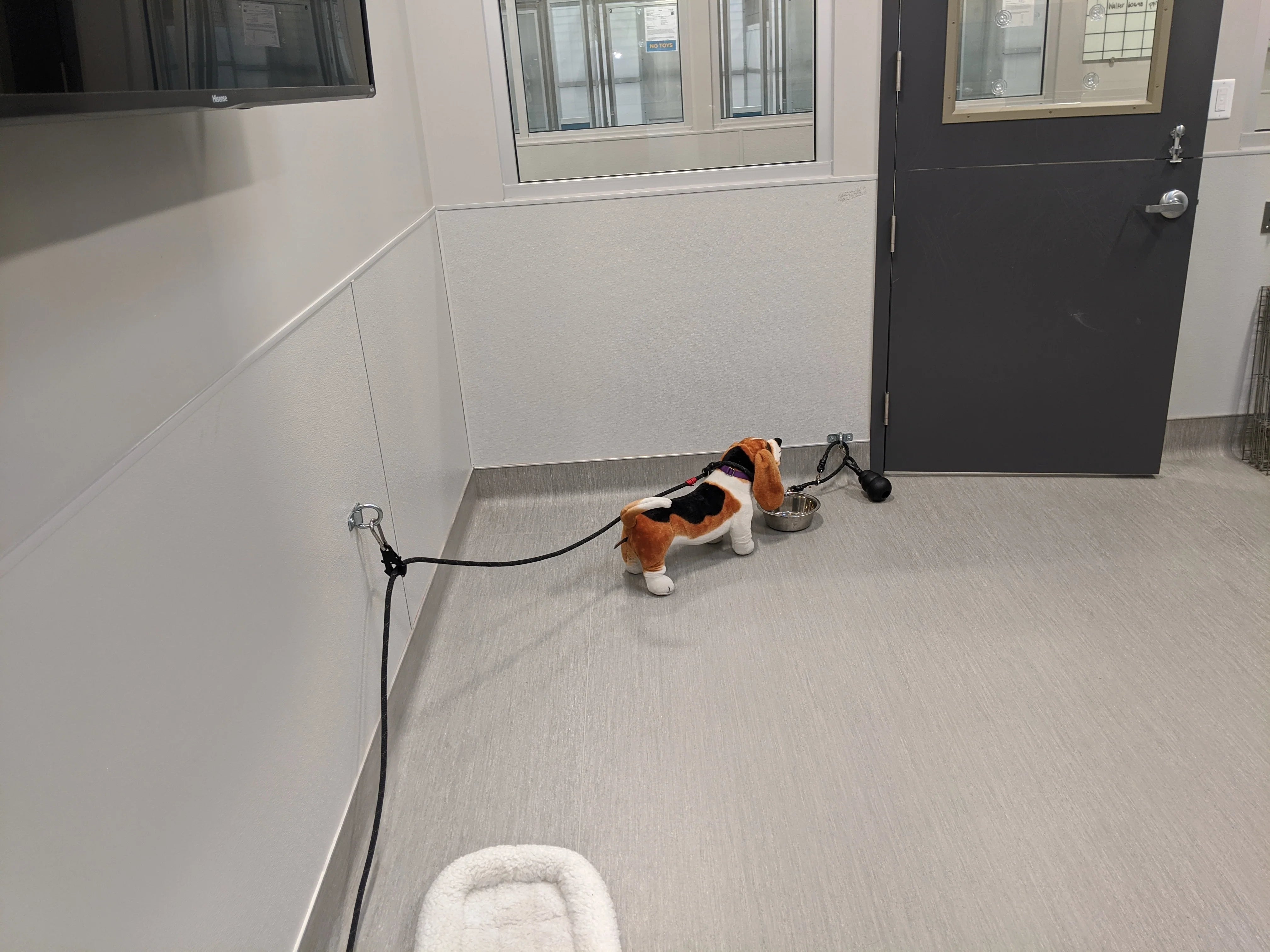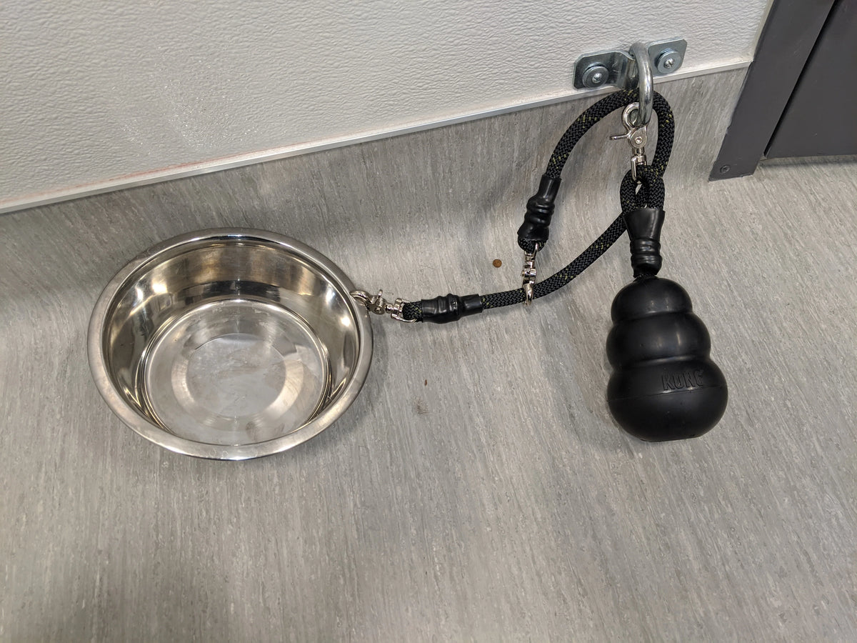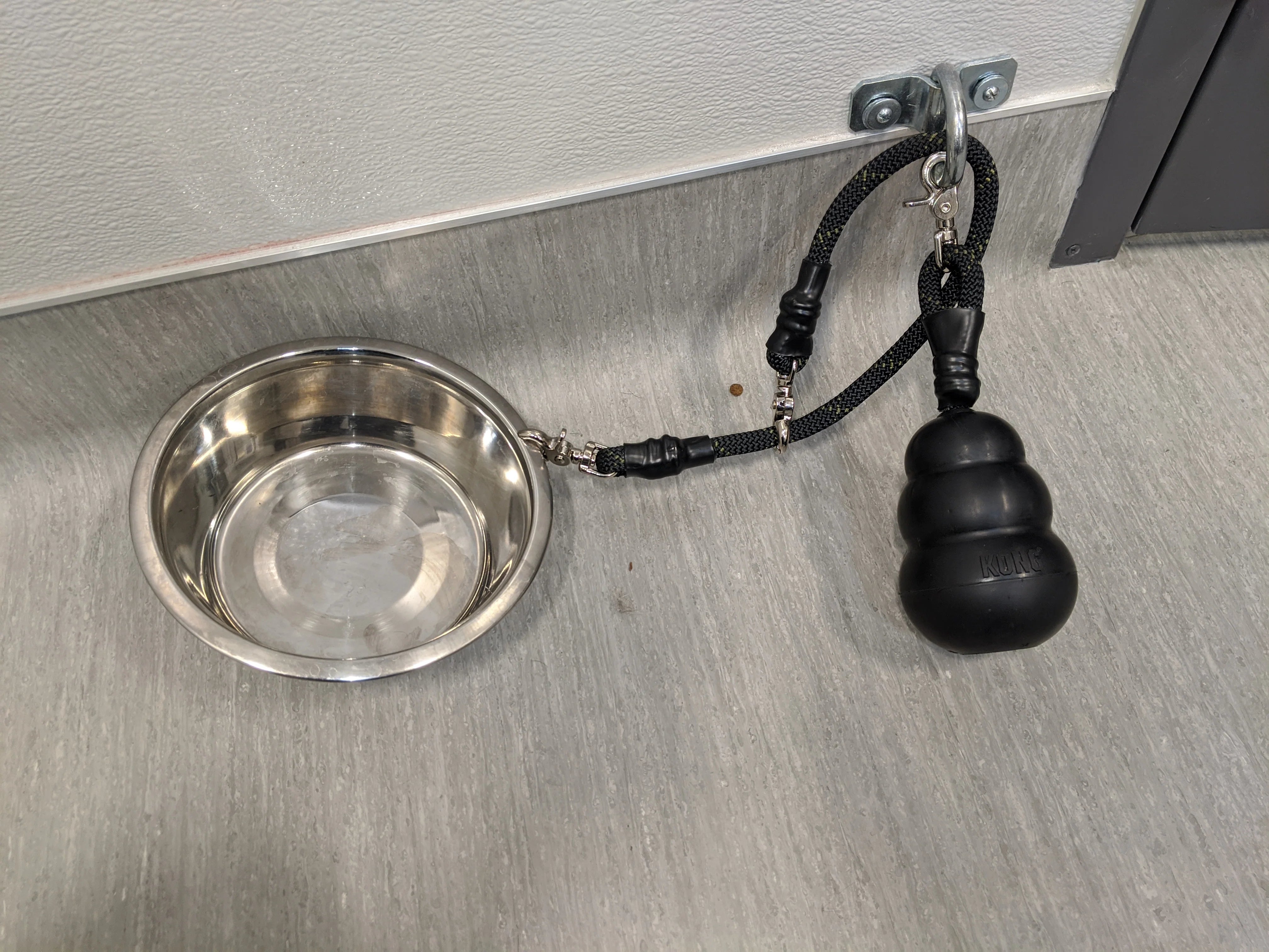 This product was originally designed for the San Diego Humane Society in response to occasional problems with resource guarding issues that resulted in risk to staff. The leash is installed in a room and allows for quick connection and disconnection of the dog on a long leash. Resources are attached to the wall and the dog is attached in a way which allows the dog to be safely removed from the resource without staff contact or risk. Resources can be custom ordered, but generally include a food bowl and a kong which have been modified for tethering to the wall.