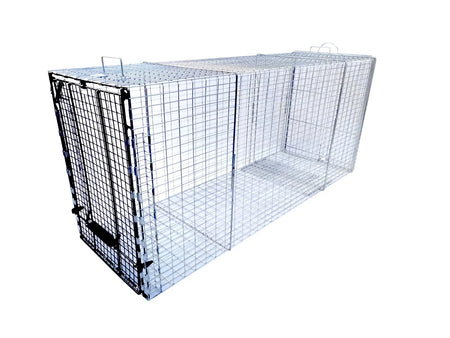 This model GT610D Pro Deluxe Extra Large Dog Trap measures in at a whopping 72"x25"x32". This is one of the largest commercially made dog traps in the world. This model uses the auto-set trap door of the entire GT (Gravity Trap) series from Tomahawk and features an easy to use release door at the other end of the trap.