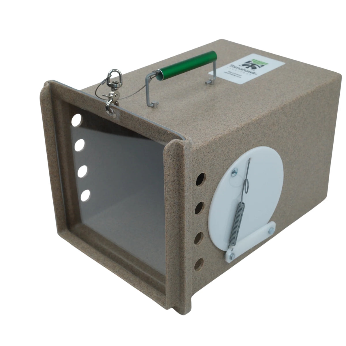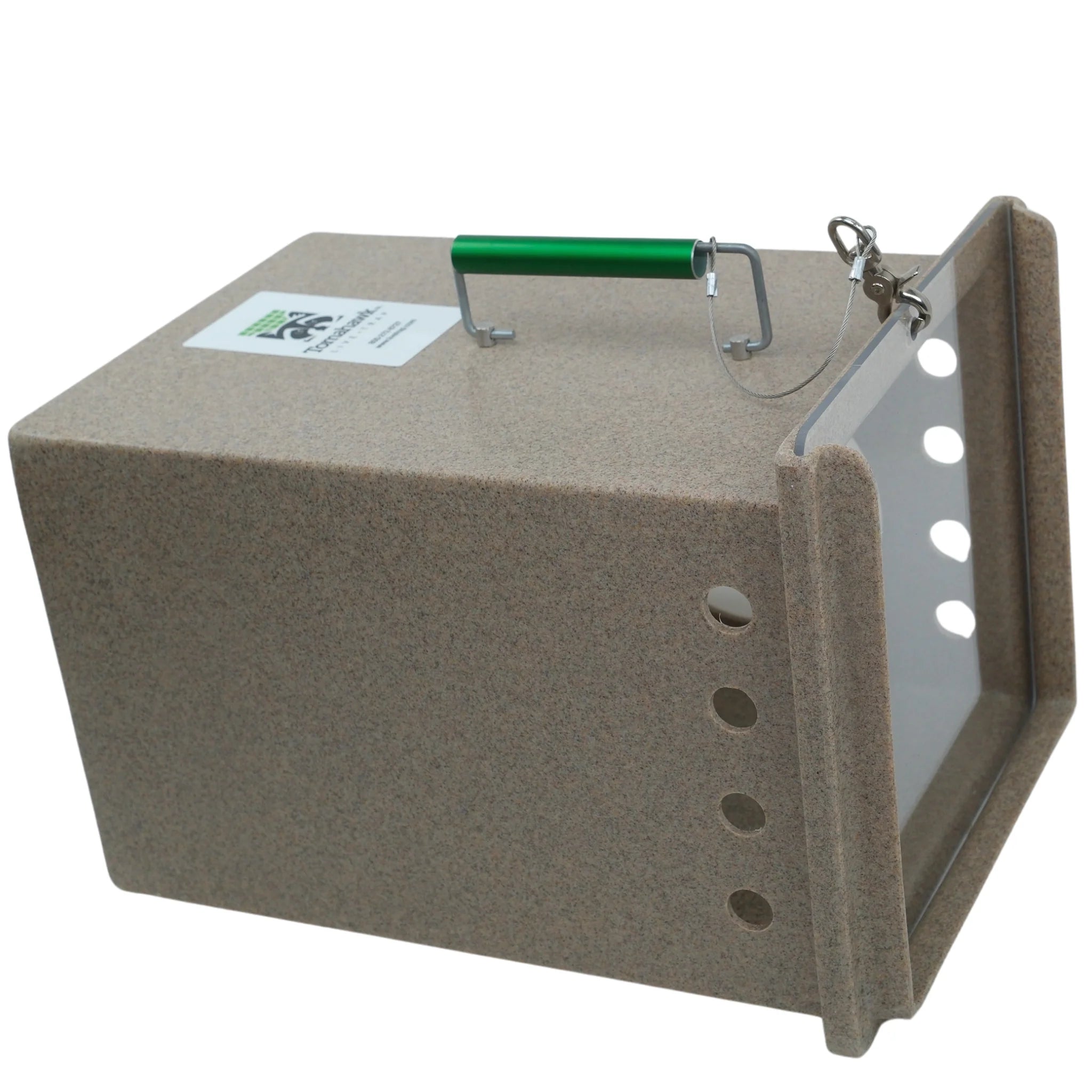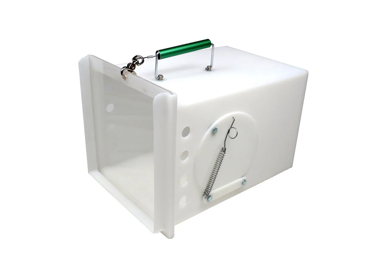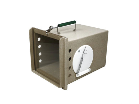 The Neighborhood Cats Den is a feral cat den that can be used as a cat handler for transporting animals or to provide a quiet place to hide within larger holding cages. These dens also provide the option of letting a cat enter the side port door by themselves for treats or to hide then quickly shutting the port door to trap the cat inside for transport without having to handle the cat directly. Features a locking side port door, front sliding clear or tinted plexi-glass door and comfort grip aluminum handle. This den also lines up with the rear sliding door of the Tomahawk 10W x 12H" and 10W x 10H" traps for easy transfer of trapped animals. These dens measure 17L x 12W x 12H" and are constructed of an easy to clean high density polyethylene. The Neighborhood Cats Den is an excellent tool to have for those housing or transporting feral cats.