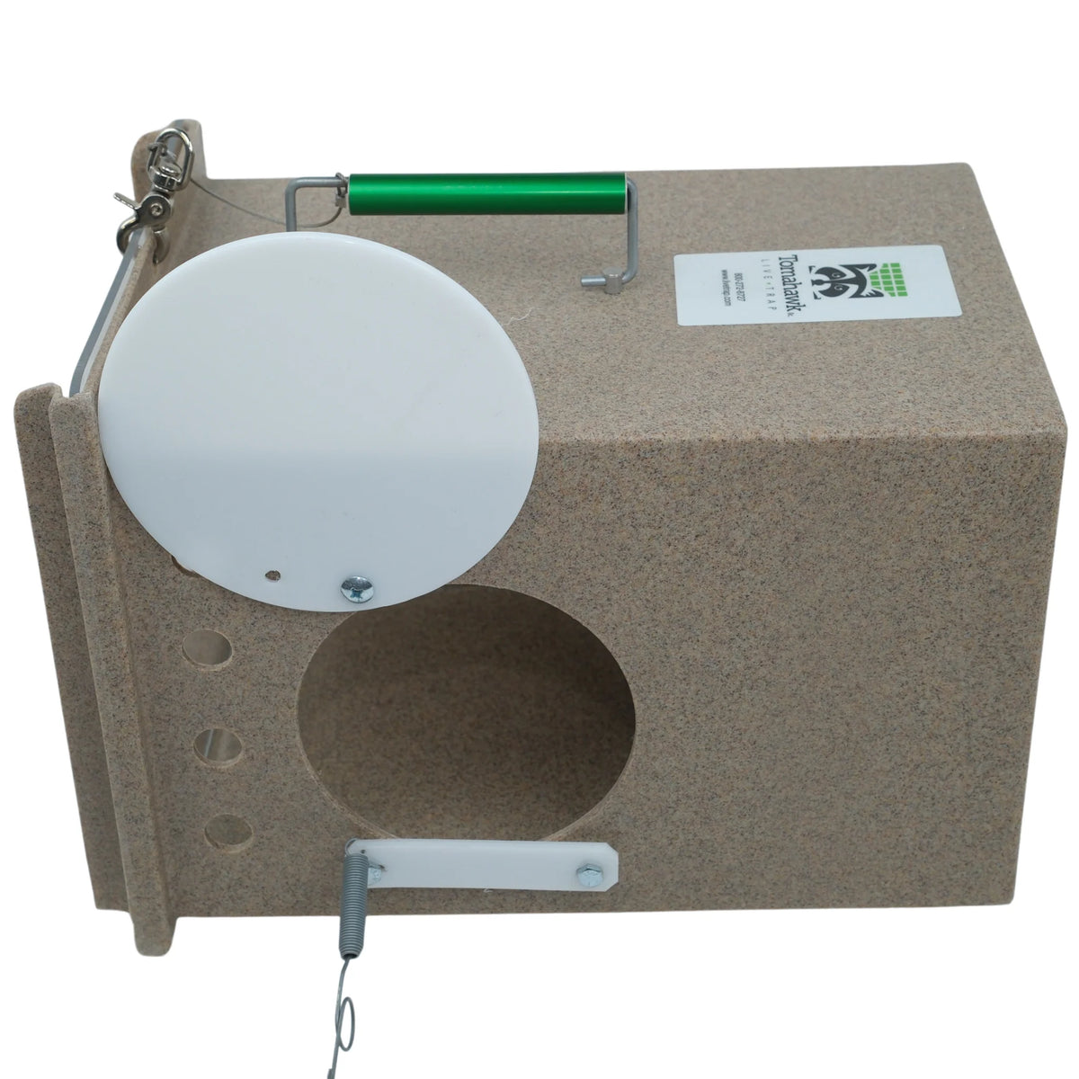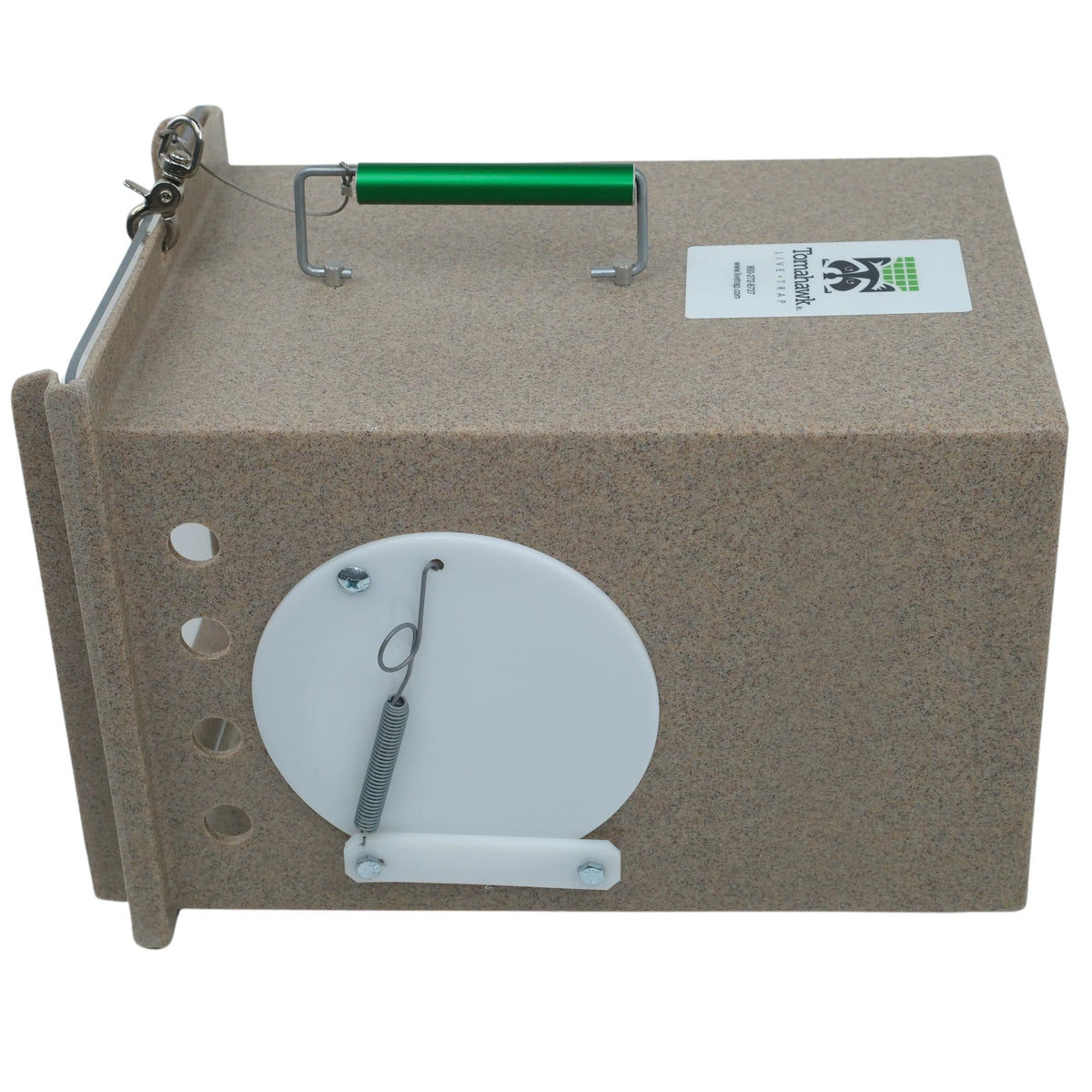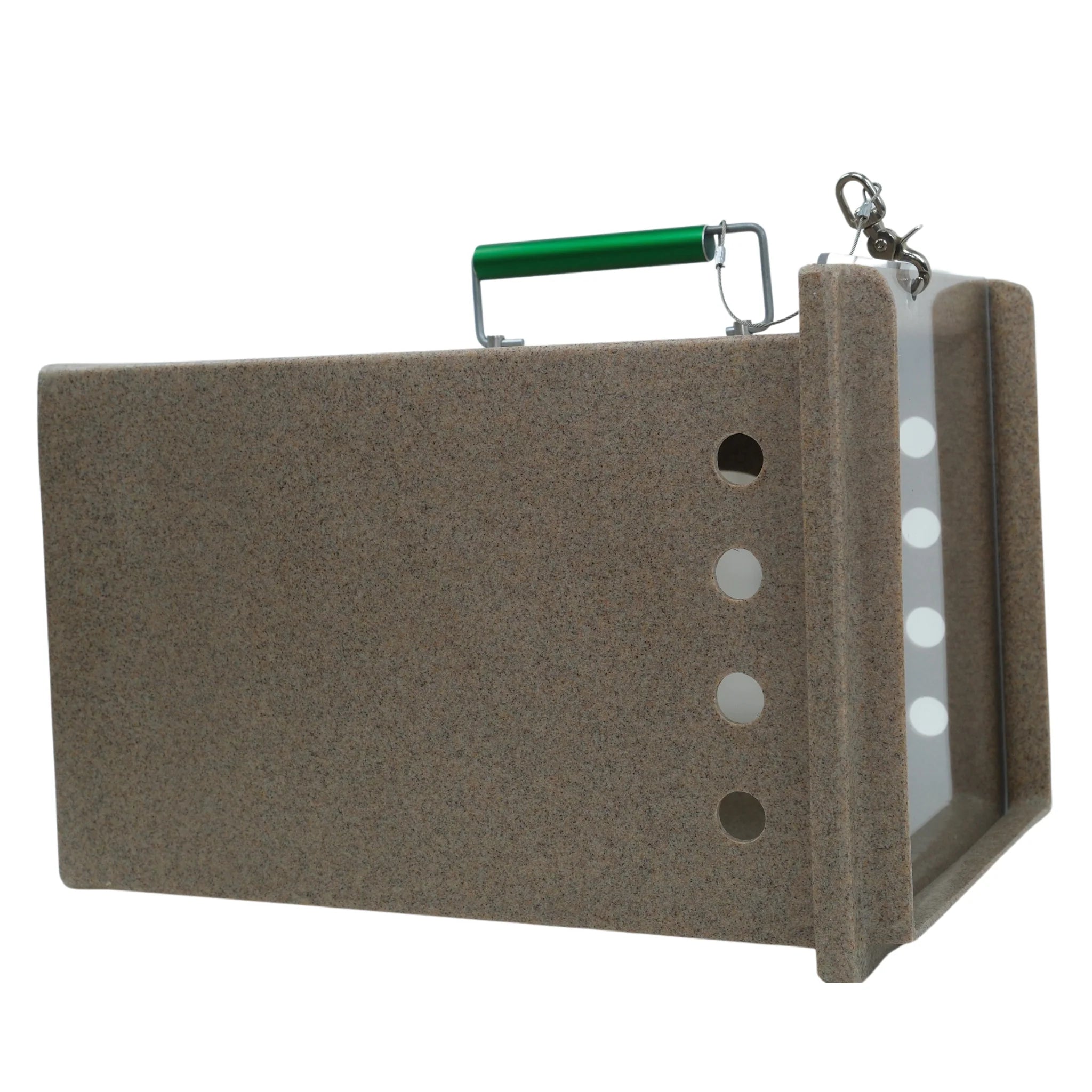 The Neighborhood Cats Den is a feral cat den that can be used as a cat handler for transporting animals or to provide a quiet place to hide within larger holding cages. These dens also provide the option of letting a cat enter the side port door by themselves for treats or to hide then quickly shutting the port door to trap the cat inside for transport without having to handle the cat directly. Features a locking side port door, front sliding clear or tinted plexi-glass door and comfort grip aluminum handle. This den also lines up with the rear sliding door of the Tomahawk 10W x 12H" and 10W x 10H" traps for easy transfer of trapped animals. These dens measure 17L x 12W x 12H" and are constructed of an easy to clean high density polyethylene. The Neighborhood Cats Den is an excellent tool to have for those housing or transporting feral cats.