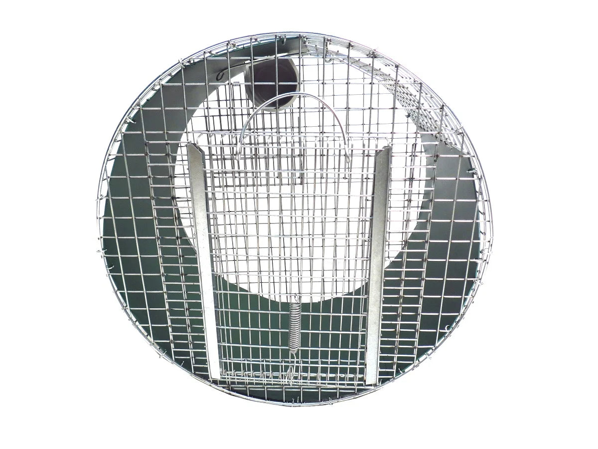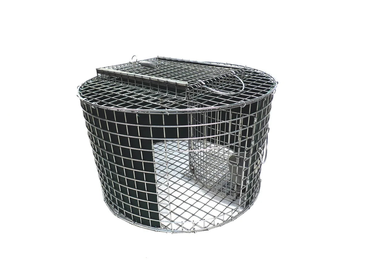 This unique trap is patent pending and was designed by inventor Randy Jack. The unique circle frame of this trap eliminates straight walls and corners for the animal to push against after being trapped. This trap features a removable bait dish, internal plastic cover to keep trapped animals calm and an easy release door for easy baiting, transfer and release. The trap measures 12" tall and has a 19" diameter. Inventor Randy Jack is a freelance pet product designer and former Portage County Humane Officer. He currently designs products for several companies around the world.