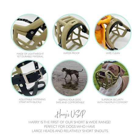 The Harry 2.0's mid-size positioning means it may be appropriate for your dog, or you might need to size up to the Mitzy or down to the Taz/Sunny depending on specific head dimensions. The Muzzle Movement provides detailed measuring instructions to help you determine which size within the Short & Wide Fit collection best matches your dog's anatomy.