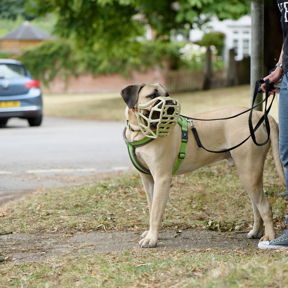 Brachycephalic Geometry: The basket's width-to-length ratio is optimized for dogs with broad heads and shortened snouts, preventing the poor fit and discomfort that occurs when large brachycephalic dogs are fitted with standard long-snout muzzles.